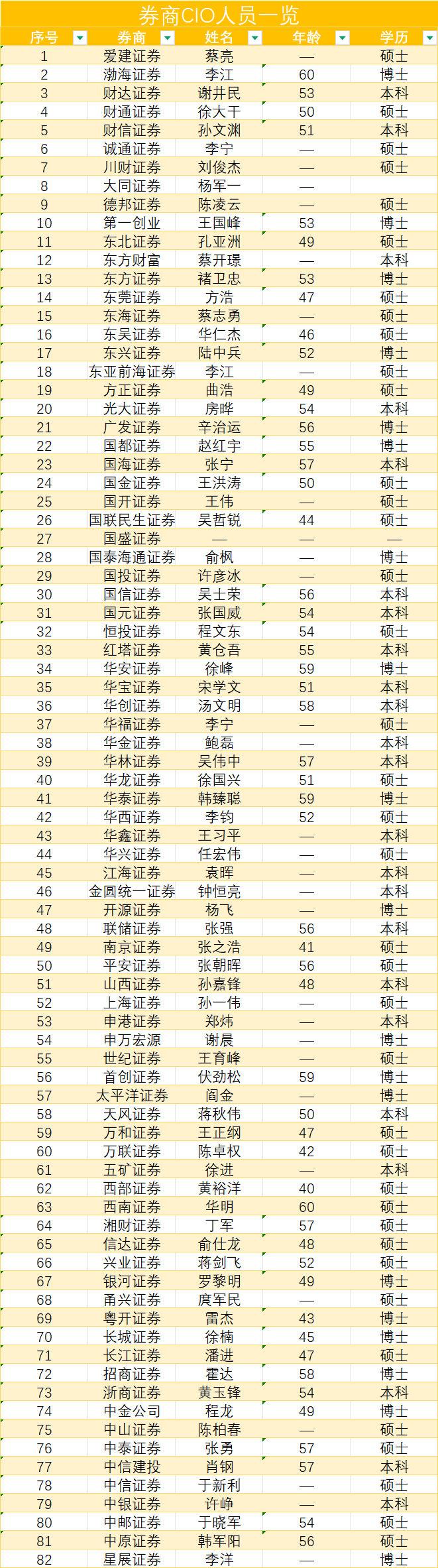 界面新闻据Choice金融终端等不完全统计,目前至少有82位券商首席信息官,他们普遍属于资深、高学历、复合型人群。