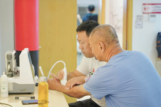一次健康义诊。总部特邀中国中医科学院广安门医院主任医师卢红蓉与北京中医药大学东直门医院副主任医师赵丹丹坐诊,为社区老人提供一对一的健康指导。两位专家结合夏季湿热特点,提示老人需注重祛湿调理、保持饮食清淡,同时通过把脉辨证,针对个体症状为有需求的老人开具调理药方。在现场流动“健康驿站”检测区,志愿者们通过便携式医疗设备为老人提供视频问诊、认知功能筛查训练、骨密度检测及一体机综合检测服务,并向骨密度数值接近临界值的老人提出针对性建议,提示其增加日照时间并适量补充钙质。老人们认真聆听检测结果说明,并记录健康指导建议。